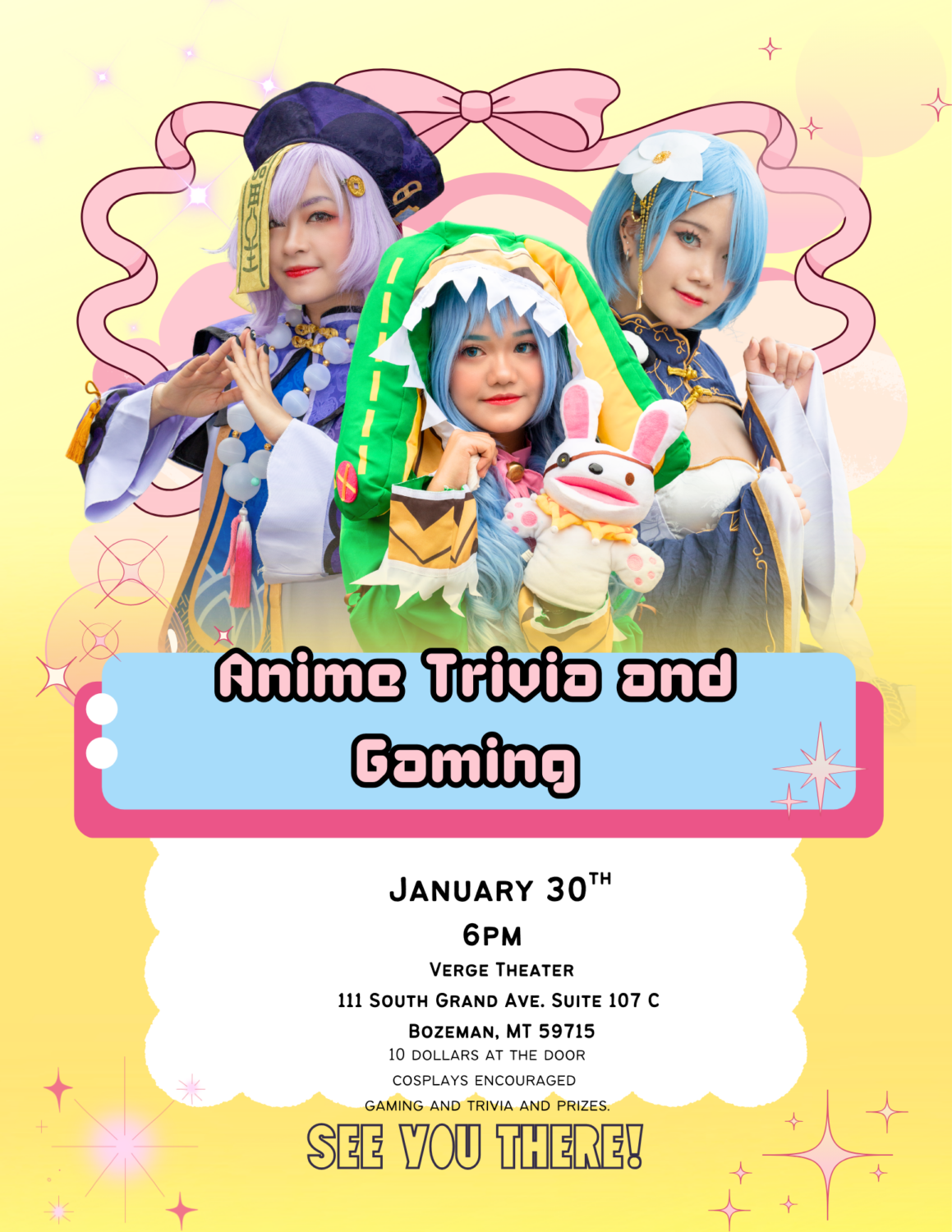 come dress up or not will have anime trivia and prizes and board games, its 10 dollars a person and welcome to come joining the fun at the verge theater in the Emerson January 30th 6pm.