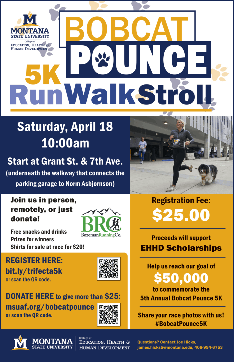 Get outside and join the College of Education, Health and Human Development for the Bobcat Pounce: 5K Run, Walk, Stroll on Saturday, April 18, 2026 starting at 10:00am. Race starting point and check-in tables will be at MSU underneath the walkway that connects the parking garage to Norm Asbjornson Hall.