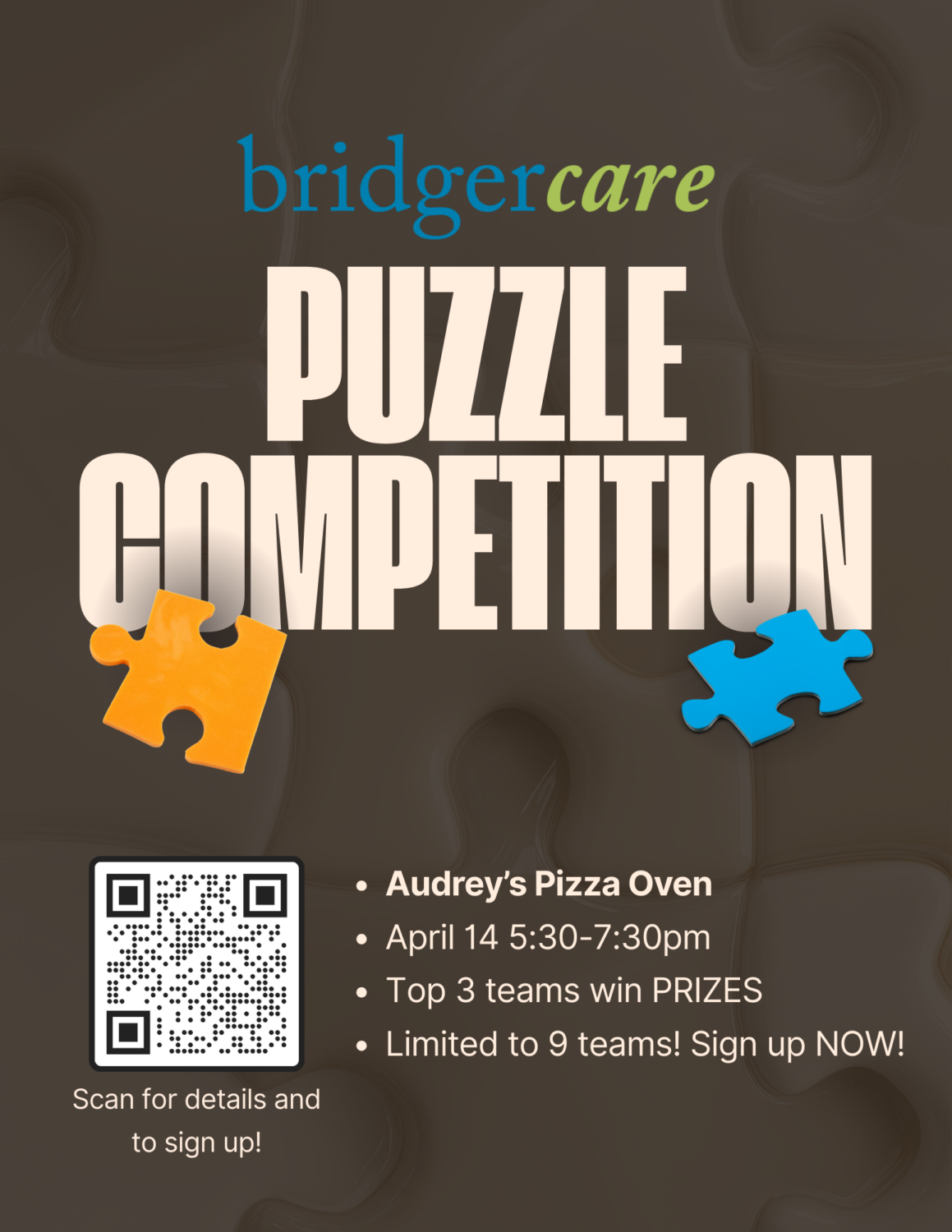 Join us on April 14th from 5:30-7:30pm at Audrey's Pizza Oven & FreeFall Brewery for the first ever Bridgercare Puzzle Competition! Teams of 1-4 are allowed with a $100 entry fee (all proceeds go to Bridgercare). We will accept 9 teams, and the top 3 teams will receive prizes! To pay your entry fee, go to www.bridgercare.org/donate and put "Puzzle Competition Registration" in the notes! Contact Julie Kerr at jkerr@bridgercare.org with any questions!