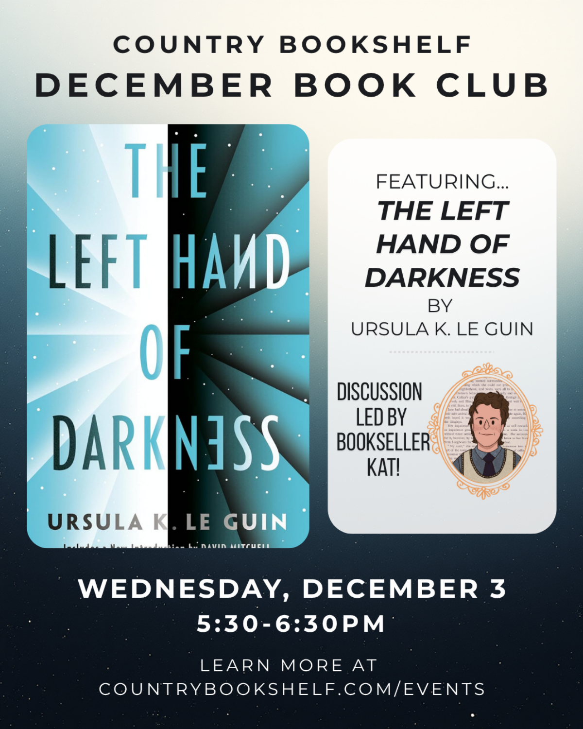 Our December selection is THE LEFT HAND OF DARKNESS by Ursula K. Le Guin. Pick up your copy at Country Bookshelf or order a copy at countrybookshelf.com today!
