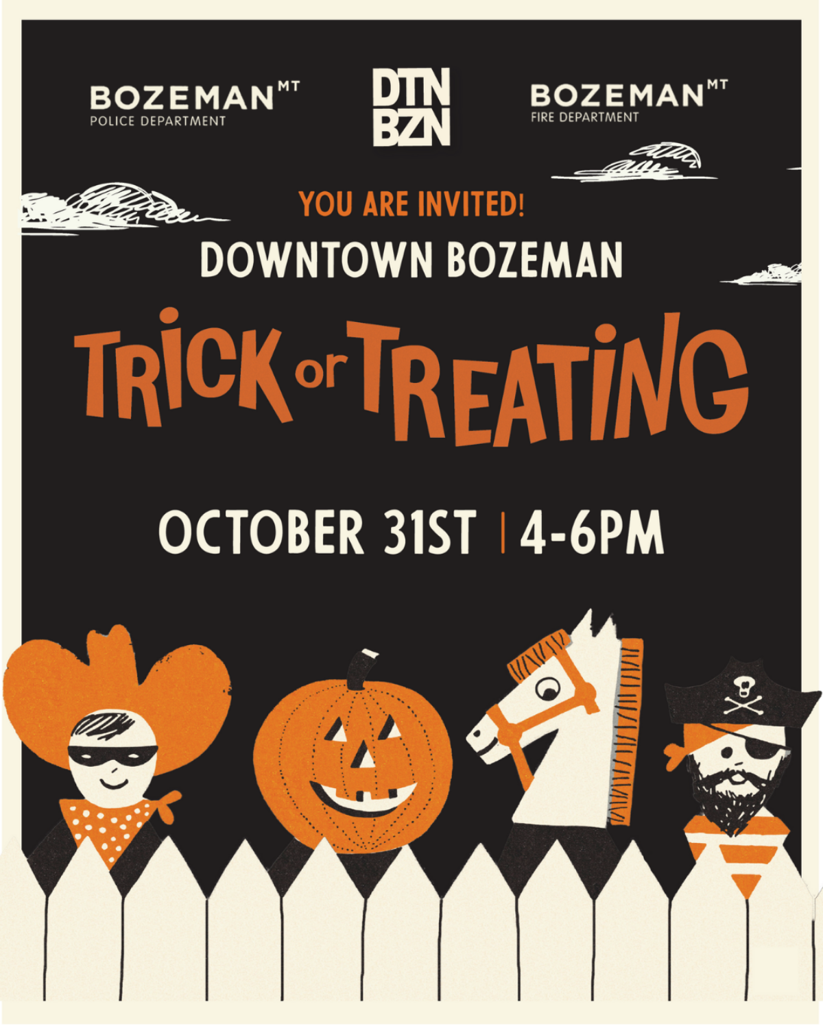 This FREE community event is made possible by the Downtown Bozeman Association, participating Downtown Businesses, and the City of Bozeman. Downtown Trick-or-Treating will take place rain, snow, or shine… so bundle up and join us for one of Bozeman’s most beloved Halloween traditions!