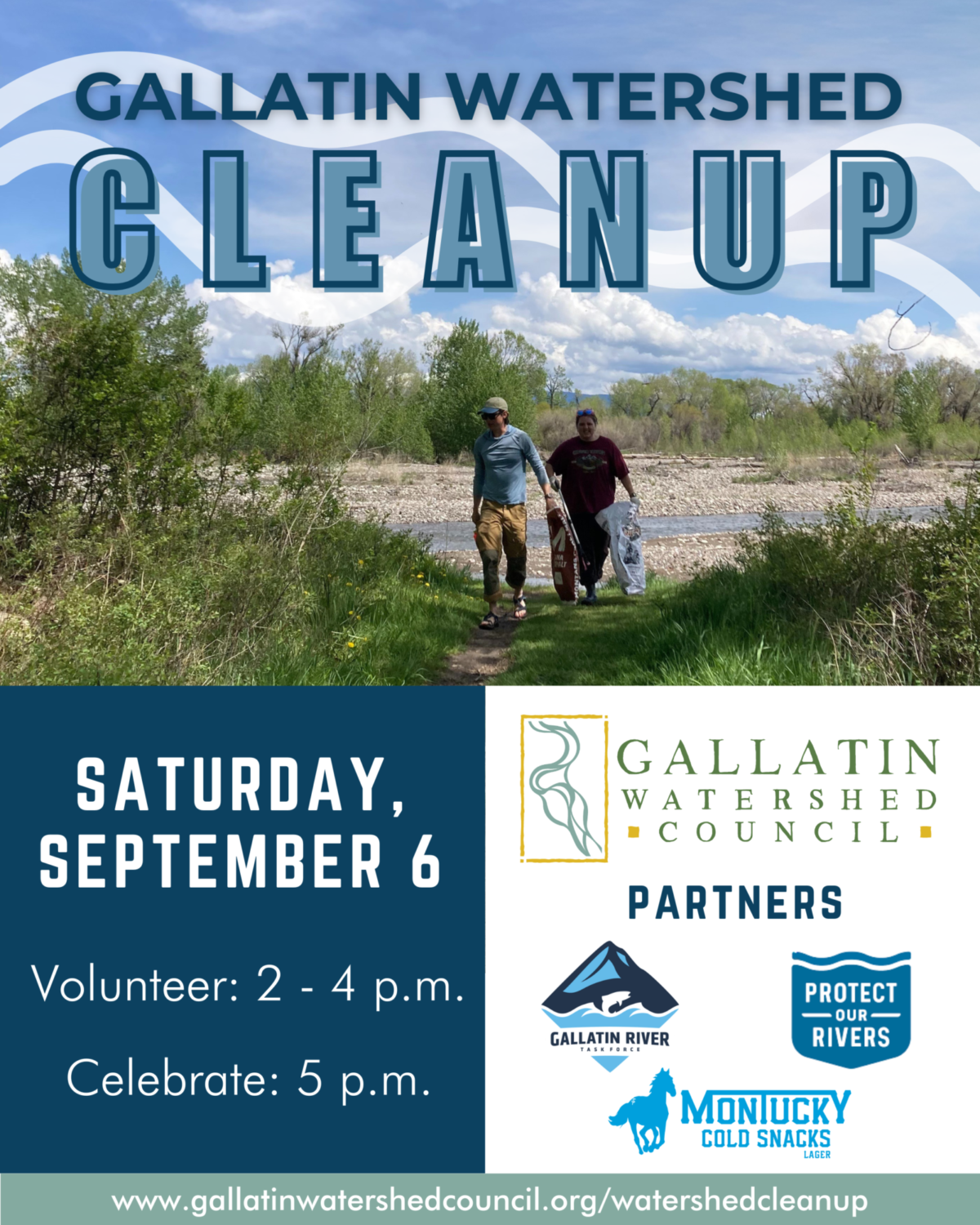 Join GWC for the annual Fall Gallatin Watershed Cleanup! Volunteers will clean up trash from Gallatin Gateway to Manhattan on Saturday, September 6, from 2-4 p.m. and then gather at Bogert Park at 5 p.m. for an after-party hosted by GWC, Protect Our Rivers, and Montucky.