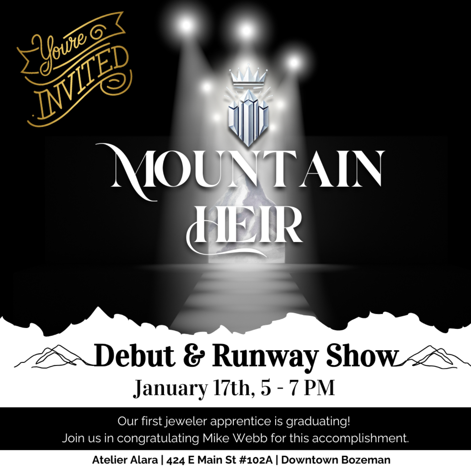 Join us at our Atelier Alara (424 E. Main) on Jan 17 at 5pm to celebrate with our apprentice goldsmith, Mike, who is graduating as a full-fledged goldsmith. This fashion show will feature all the pieces in his "final exam" collection! Refreshments and fun! More details here: https://bit.ly/MtnHeirDebut (NOTE: This is NOT the main gallery at 42 W Main, but rather the Atelier on East Main St in Downtown Bozeman).