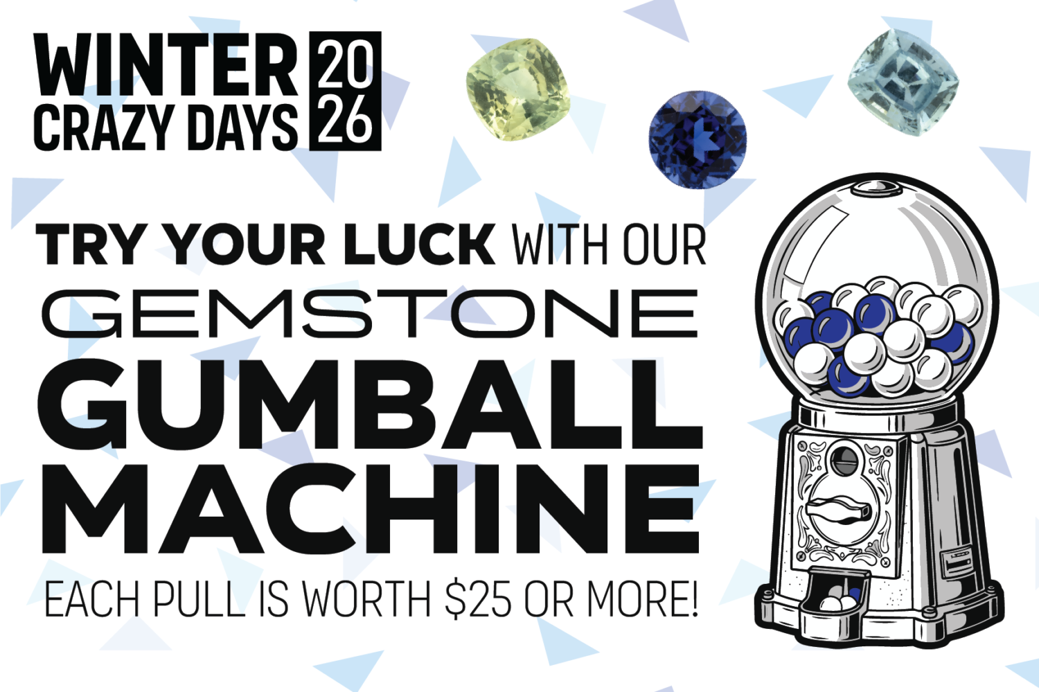 And while you're in, try your luck at our Gemstone Gumball Machine. Drop $20, crank the wheel, and walk away with a natural gemstone worth $25 or more. Some gems could be worth up to $100!