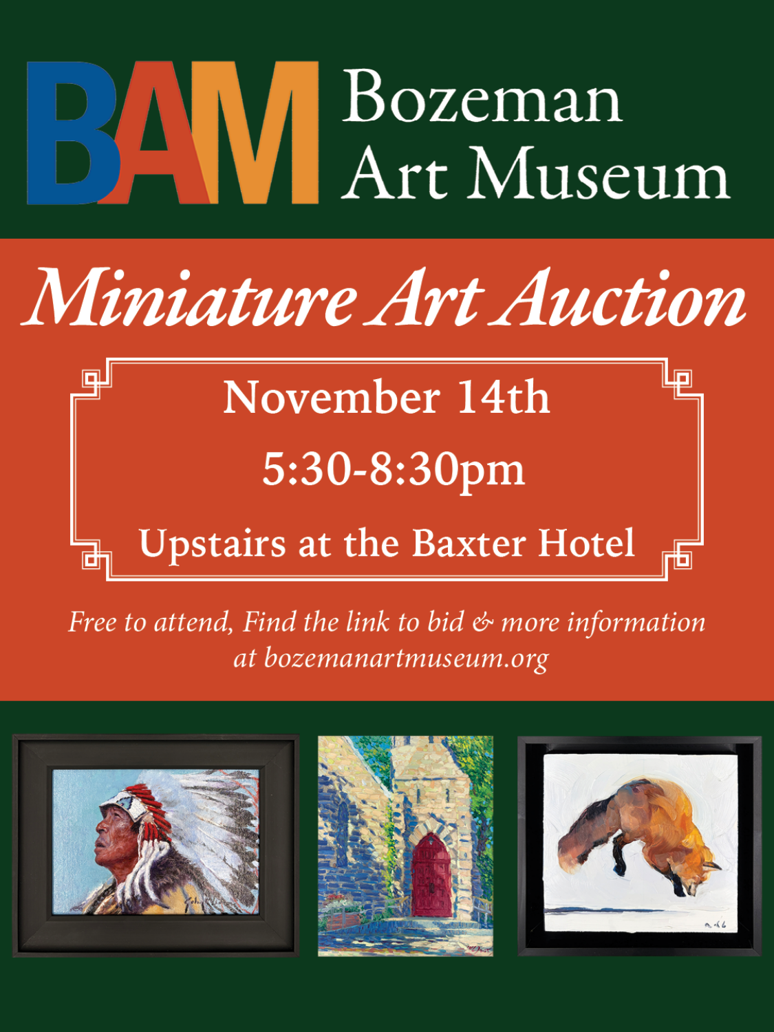 The Miniature Art Auction is free to attend and our biggest fundraiser of the year for Bozeman Art Museum. Help support keeping our classes free for our partnering elementary schools and expand our exhibits by bidding on some miniature masterpieces. Work by Kevin Red Star, William Haskell, Nic Fischer, and many more BAM artists will be available for purchase. Also see the full catalog online at bozemanartmuseum.org by November 10th.