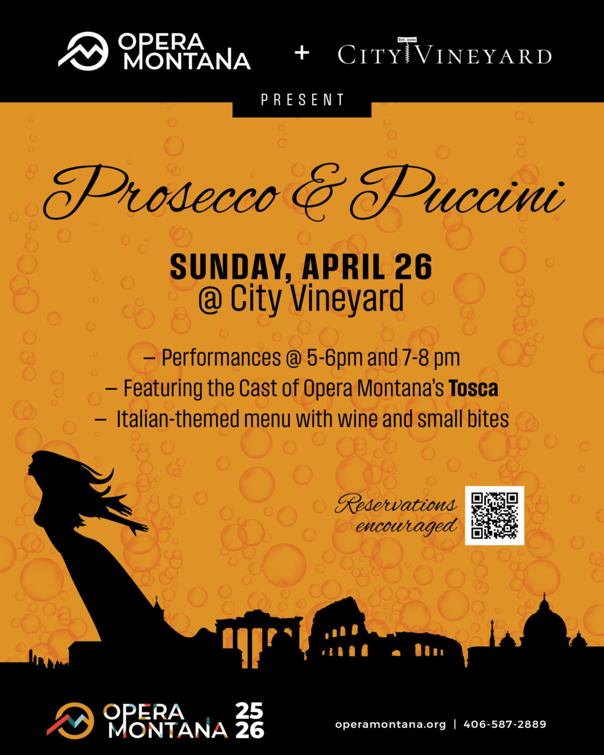 Join us April 26 for an evening of Italian-inspired cuisine and stirring performances from the cast of Tosca presented by Opera Montana. Enjoy selections from this beloved opera throughout the night, with live performances at 5:00 PM and 7:00 PM.