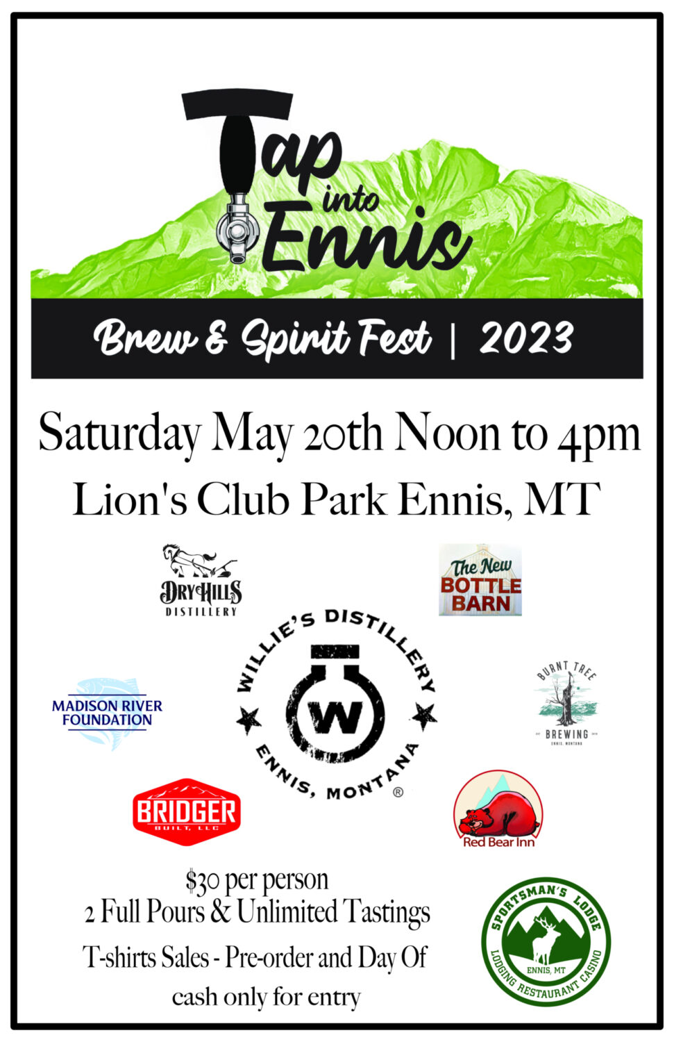 TAP into Ennis is a beer, wine, and spirits festival on the banks of the Madison River. Come try selections from Montana based businesses. With a $30 entry free comes 2 full pours plus unlimited tastings. Entry is free for designated drivers. Grab a bite to eat from the local food trucks and pick up a TAP into Ennis event t-shirt as well.