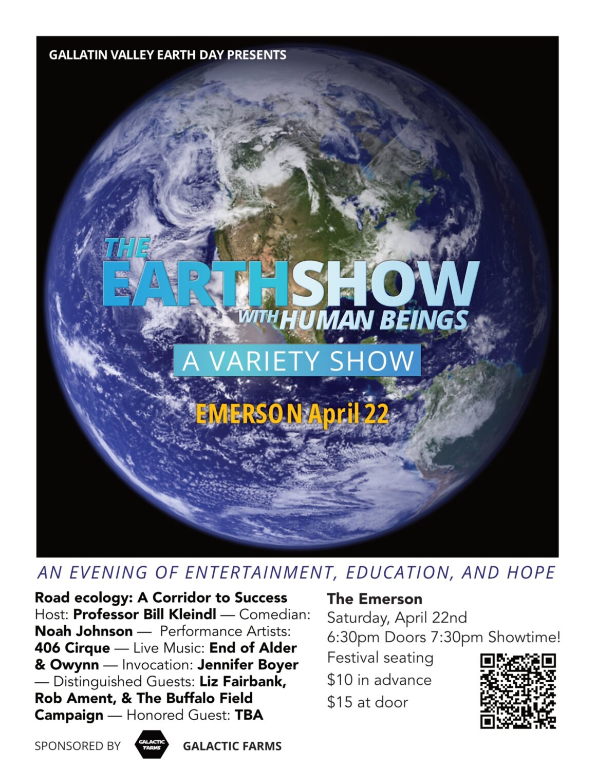 A practice in community building, “The Earth Show featuring Human Beings” aims to educate, celebrate, honor and inspire. Featuring host: Professor Bill Kleindl, special guests: road ecologists Liz Fairbank & Rob Ament alongside Buffalo Field Campaign. Entertainment sprinkles by 406 Cirque, comedian Noah Johnson, music by End of Alder and soloist Owynn. Gallatin County Earth Day invites you to set aside an evening to strengthen our sense of togetherness.