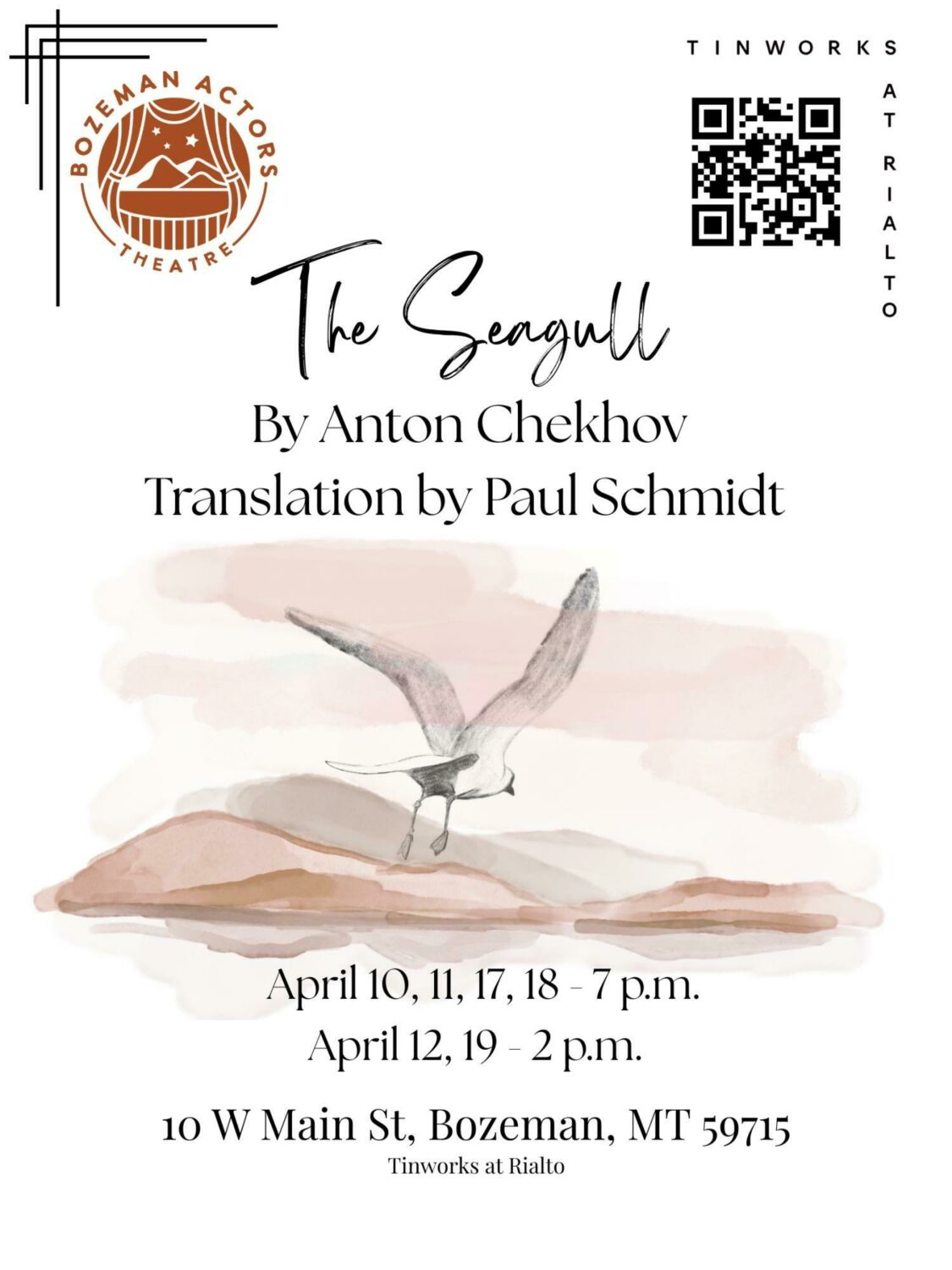 The Seagull: A play by Anton Chekhov: translated by Paul Schmidt. Bozeman Actors Theatre presents the first of Anton Chekhov's masterpieces. The Seagull is a four act play, taking place in the Russian countryside during a sultry summer, populated by friends, family, actors, and lovers. Enjoy this live performance with an outstanding local cast at the Tinworks at Rialto, 10 West Main St. Shows are Friday, April 10 at 7pm, Saturday, April 11 at 7pm, Sunday, April 12 at 2pm, Friday, April 17 at 7pm, Saturday, Apil 18 at 7pm, Sunday, April. 19 at 2pm. Tickets $30, Students $15. https://www.bozemanactorstheat...
