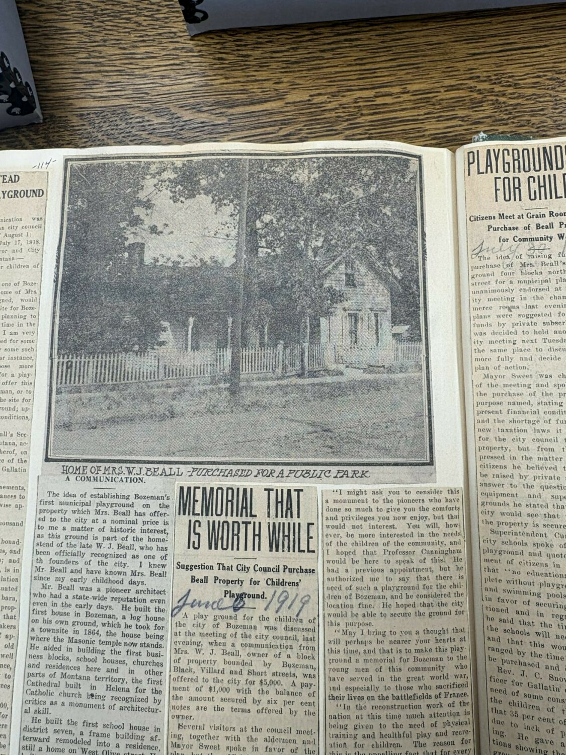 Many of these clippings allow you to follow her life through the growth of our small town where she was able to devote her time to build up the community through her work teaching Sunday School with St. James Episcopal Church, where in 1883 she would donate the historic bell, which still is housed beautifully in the bell tower. Her work with the Women’s Christian Temperance Union, a key organization in the suffragist movement and social reform, the Pioneers’ Society of Gallatin County, the ultimate record keepers of our home where Rosa served four terms as president, the Order of the Eastern Star, a charitable organization, as a librarian for the Montana Historical Society, and one of great note, the sale of her land and home for the creation of a park we lovingly know as Beall Park.